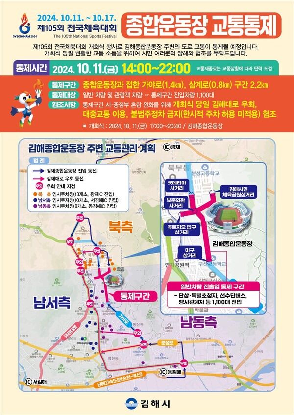 개회식 당일인 10월 11일 오후 2시부터 김해종합운동장으로 가는 도로가 통제될 예정입니다. 이로 인해 교통 혼잡이 예상되니, 대중교통 이용을 고려하시거나 미리 우회 경로를 파악하는 것이 좋습니다. 김해시는 셔틀버스 운영을 통해 관중들의 편리한 이동을 지원할 계획입니다.